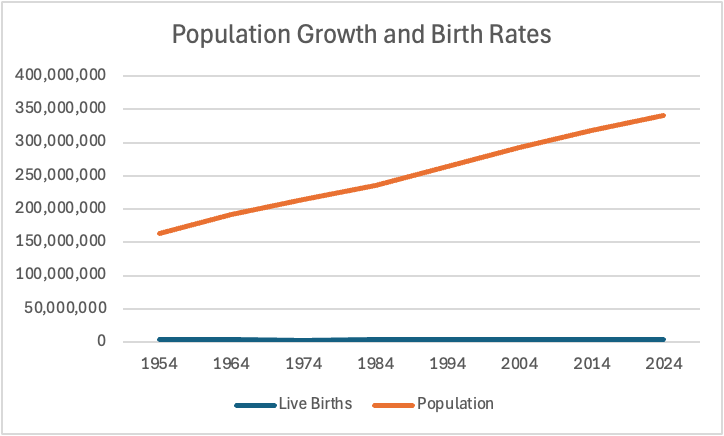 First of all, let’s look at the numbers. Over the past 70 years (my lifetime), the population of our United States has increased by more than one hundred and seventy-seven MILLION people — or roughly two and one half MILLION people per year. During that same 70 years, the TOTAL NUMBER of live births has remained at roughly four million per year.